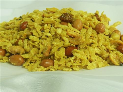 A mixture of fried rice puffs, peanuts, raisins and spices with out the sugar.