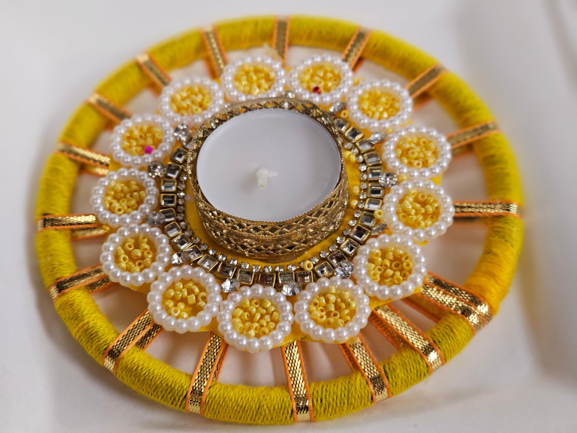 A handcrafted 5 inch inch diya with a replaceable tealight candle.