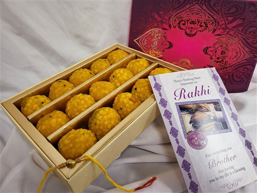 15 pcs of bundi ladoo in our dark pink gift box with a rakhi and a card