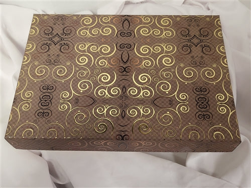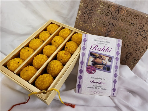 15 pcs of bundi ladoo in a brown & gold gift box with a rakhi & card