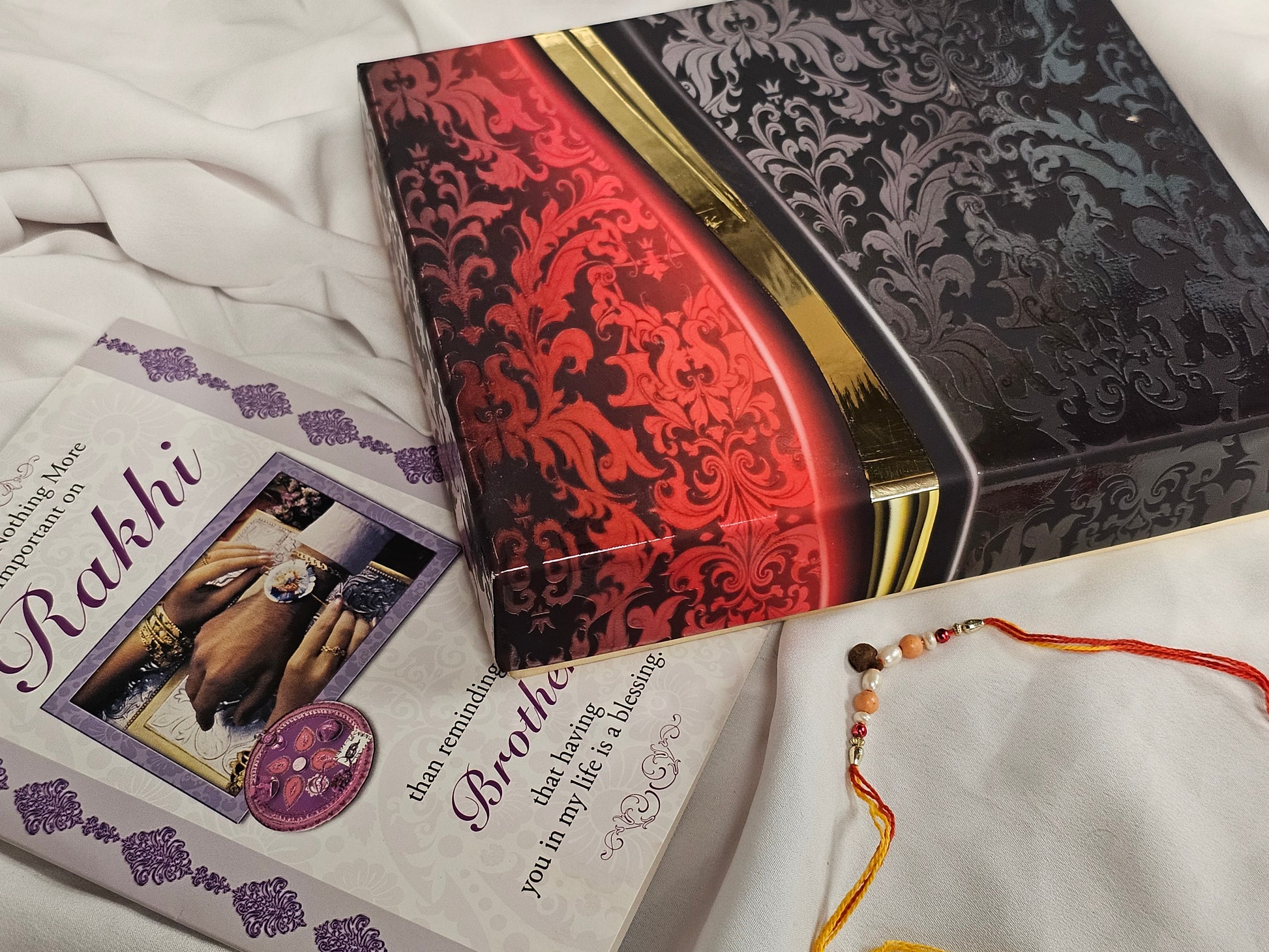 1lb of our mix sweets all packed in a red kundan gift box with a rakhi & card