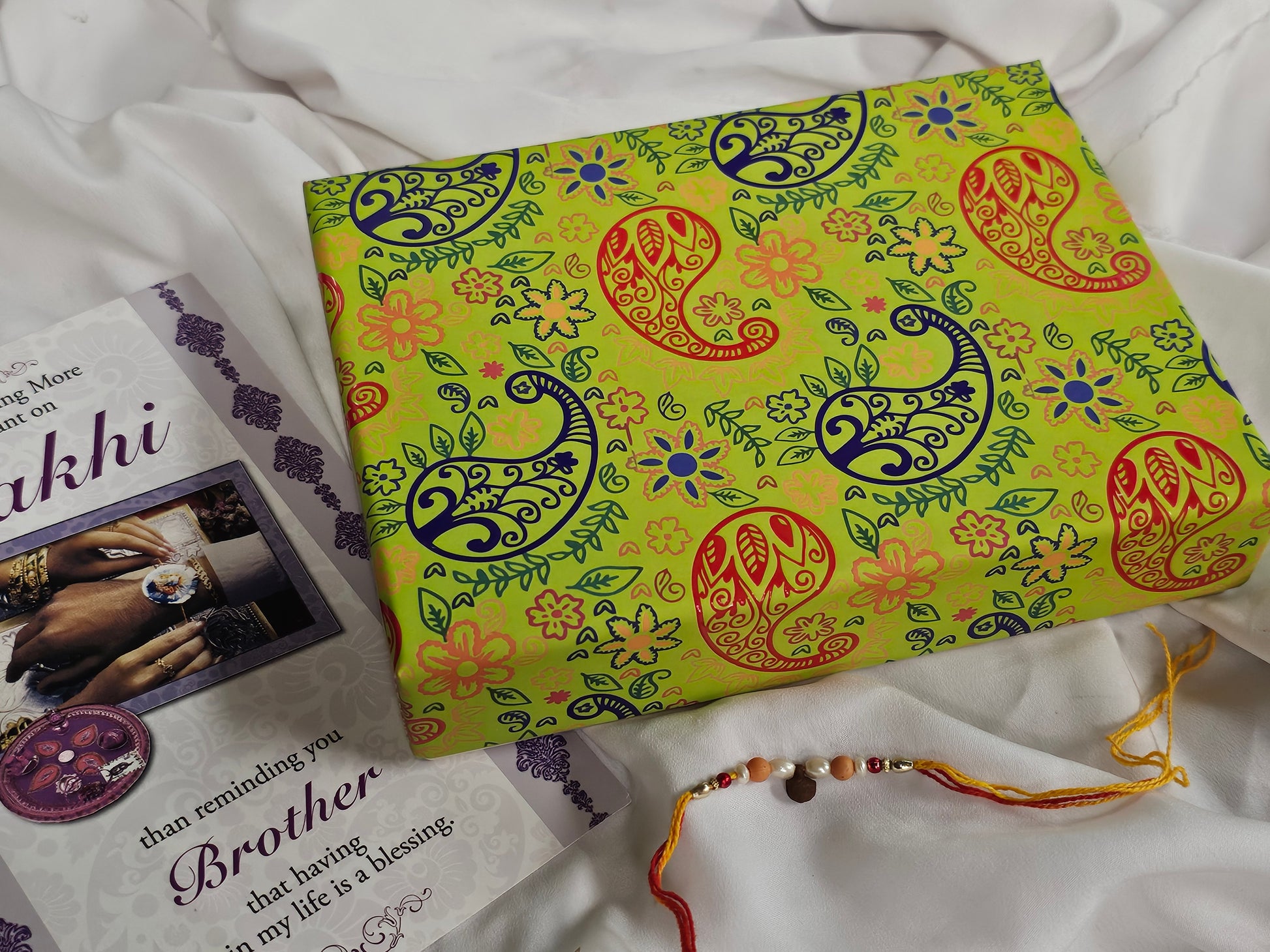 one pound of mix sweets in a green paisley gift box with a rakhi & card