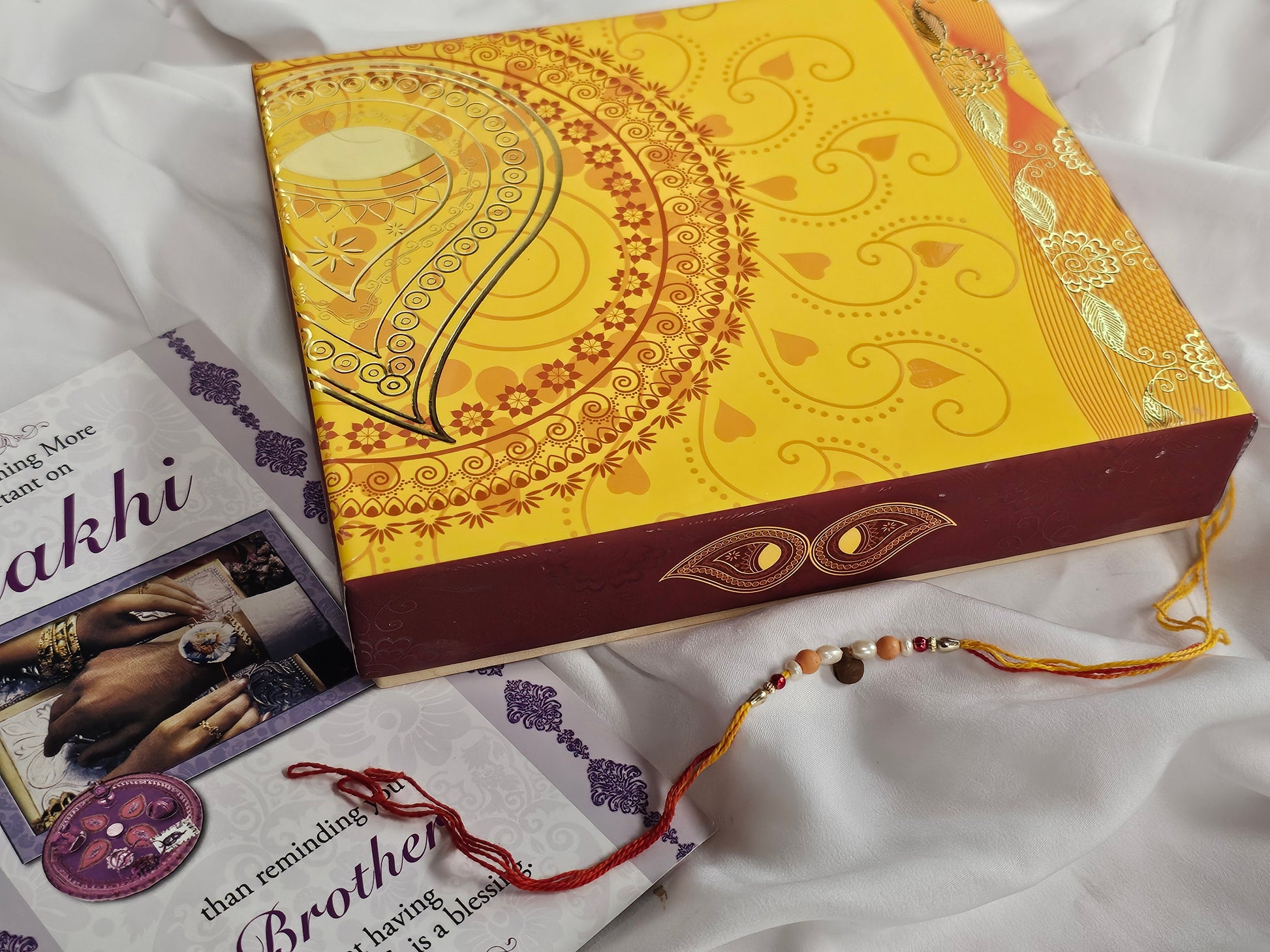 one pound of mix sweets in a black & gold paisley gift box with a rakhi & card