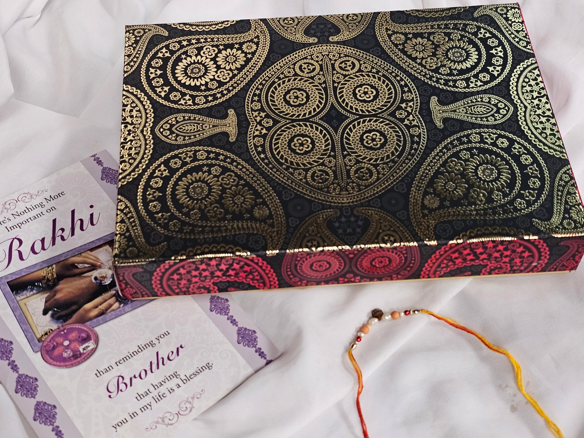 2lb of mix sweets in our black & gold gift box with a rakhi and a card