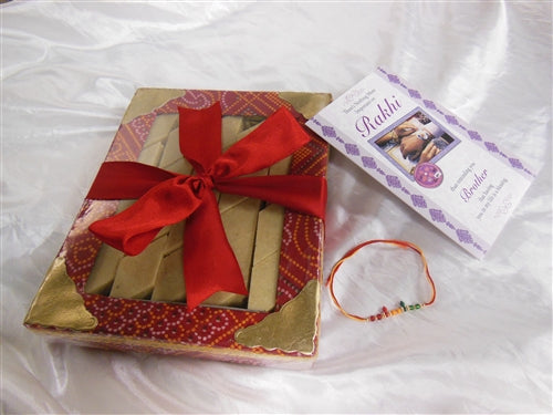 2lb of kaju katri in a bandini gift box with a rakhi and a card