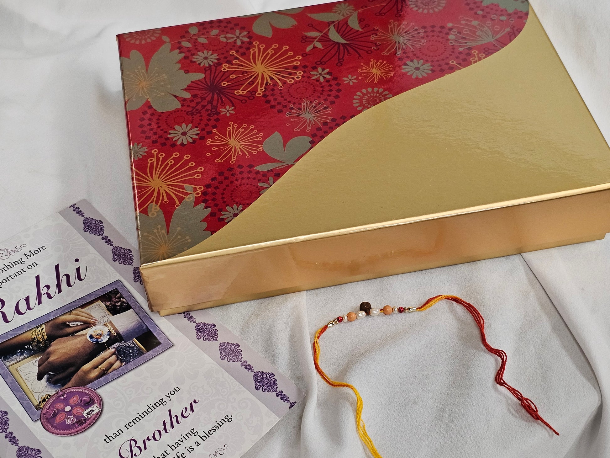 2lb of mix sweets in our golden red leaves gift box with a rakhi and a card